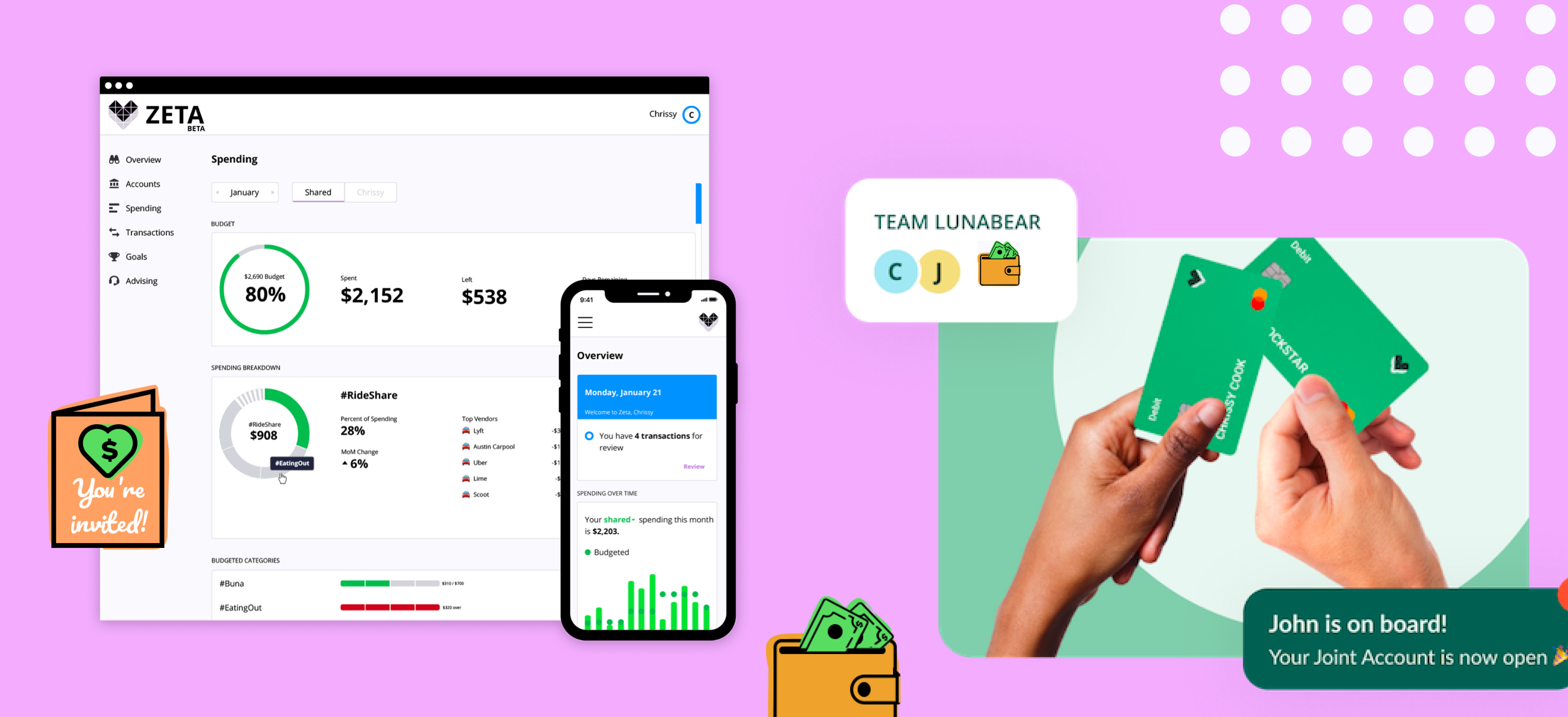 Every couple manages their money differently. Gone are the days of exclusively joint bank accounts. Zeta's goal was to solve couples' finance in a way that promoted mutual growth, trust, and transparency. Here's how we solved the problem: